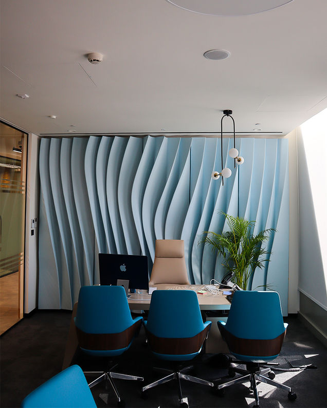Walls, desks, and bespoke furniture pieces are shaped with continuous curves and seamless forms, creating a sense of cohesion throughout the interior. At the same time each room unfolds its own character, exploring subtle variations in mood to reflect the way the space is used.