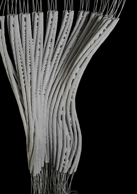 The porous shell of the house is a fiber twist of plant origin. The twist changes according to the loads and needs of the internal spaces, determining surfaces with a variable density: they can be compact in order to stiffen the whole or clear in order to allow the natural light to penetrate the inside environment.